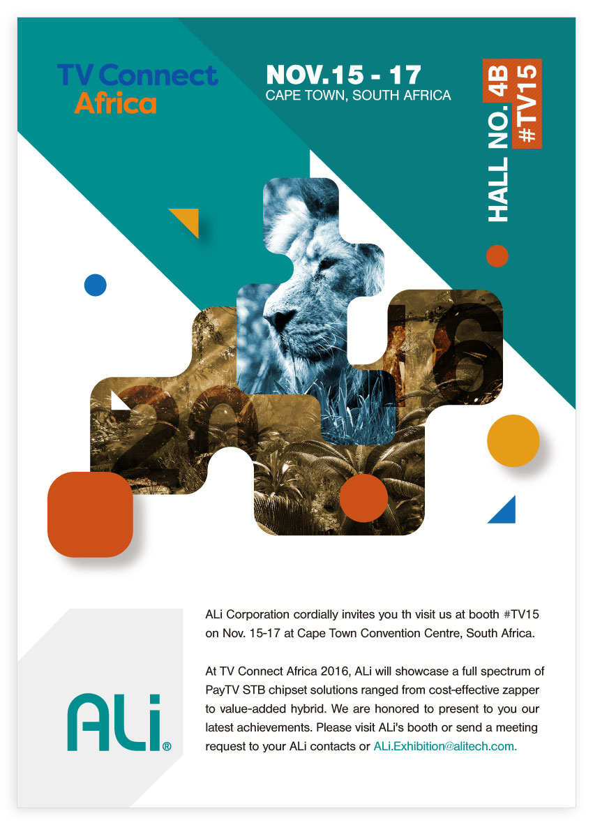 At TV Connect Africa 2016, ALi will showcase a full spectrum of PayTV STB chipset solutions ranged from cost-effective zapper to value-added hybrid. We are honored to present to you our latest achievements. Please visit ALi's booth or send a meeting request to your ALi contacts or 该 Email 地址已受到反垃圾邮件插件保护。要显示它需要在浏览器中启用 JavaScript。.
