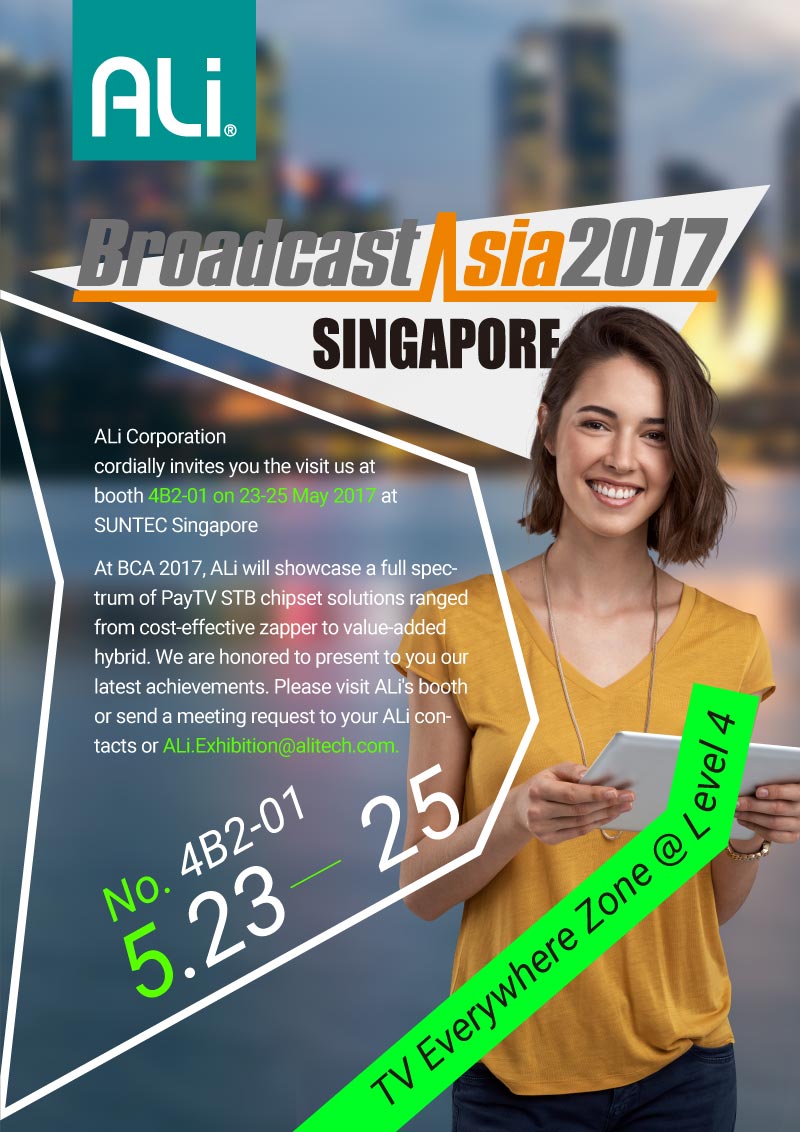 At BCA 2017, ALi will present a full spectrum of PayTV STB chipset solutions ranged from cost-effective zapper to value-added hybrid. We are honored to present to you our latest achievements. Please visit ALi's booth or send a meeting request to your ALi contacts or 该 Email 地址已受到反垃圾邮件插件保护。要显示它需要在浏览器中启用 JavaScript。.